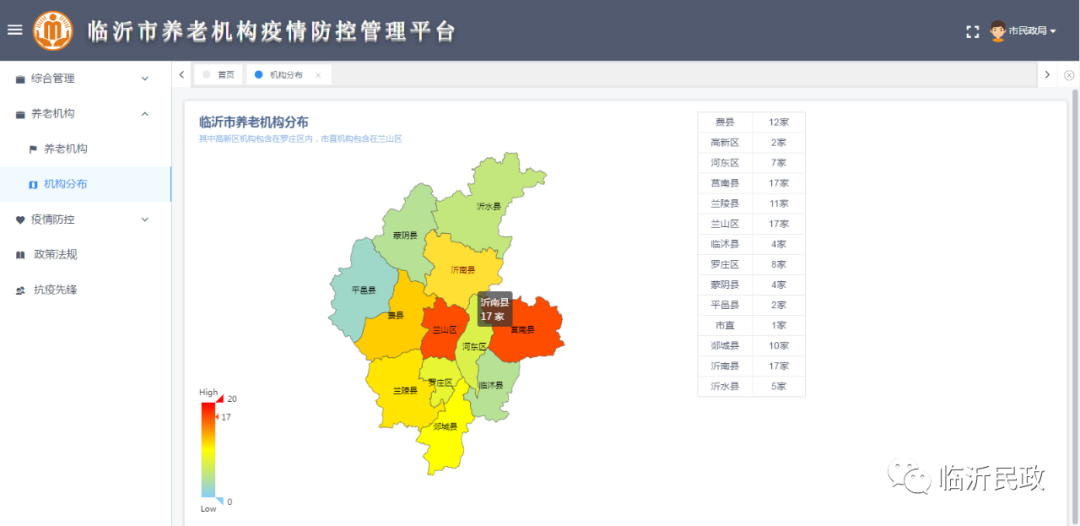 目前,养老机构已解除全封闭状态,逐步恢复服务,为贯彻落实中央关于整治形式主义、官僚主义的决策部署,切实为基层防疫工作减负,同时,及时掌握养老机构在恢复服务期间人数变化和工作情况,市民政局在市纪委监委派驻第二纪检监察组的指导下,推出了“临沂市养老机构疫情防控管理平台”,于近日正式上线运行。