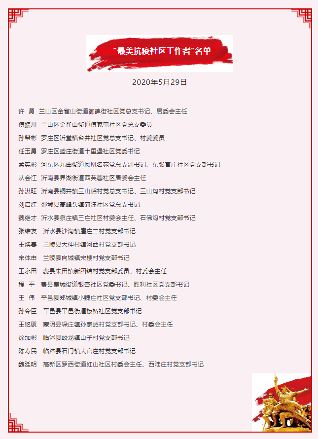 6月28日,“致敬最美的你”—临沂市“践行沂蒙精神·最美抗疫人物”发布仪式举行。由市民政局牵头评选的20名社区工作者获得了“最美抗疫社区工作者”荣誉称号。