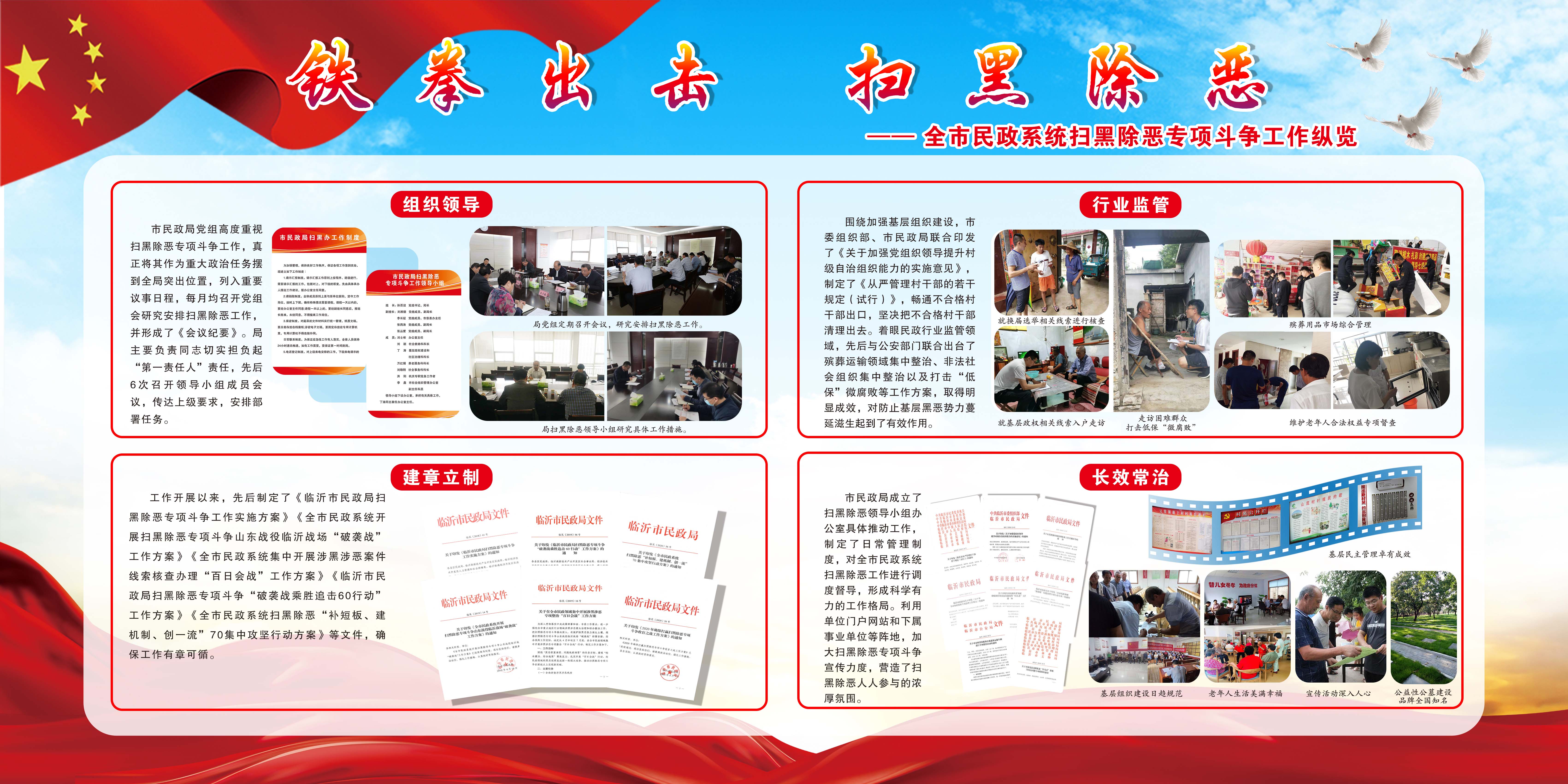 建章立制到位。工作开展以来,先后制定了《临沂市民政局扫黑除恶专项斗争工作实施方案》《全市民政系统开展扫黑除恶专项斗争山东战役临沂战场“破袭战”工作方案》《全市民政系统集中开展涉黑涉恶案件线索核查办理“百日会战”工作方案》《临沂市民政局扫黑除恶专项斗争“破袭战乘胜追击60行动”工作方案》《全市民政系统扫黑除恶“补短板、建机制、创一流”70集中攻坚行动方案》等文件,确保工作有章可循。