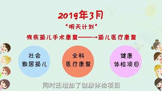2019年3月,民政部将“明天计划”正式更名为“孤儿医疗康复明天计划”,将救治对象延伸至社会散居孤儿,救治病种拓展到全科医疗康复,同时还增加了健康体检项目。