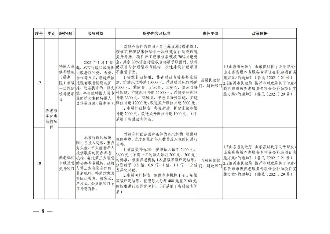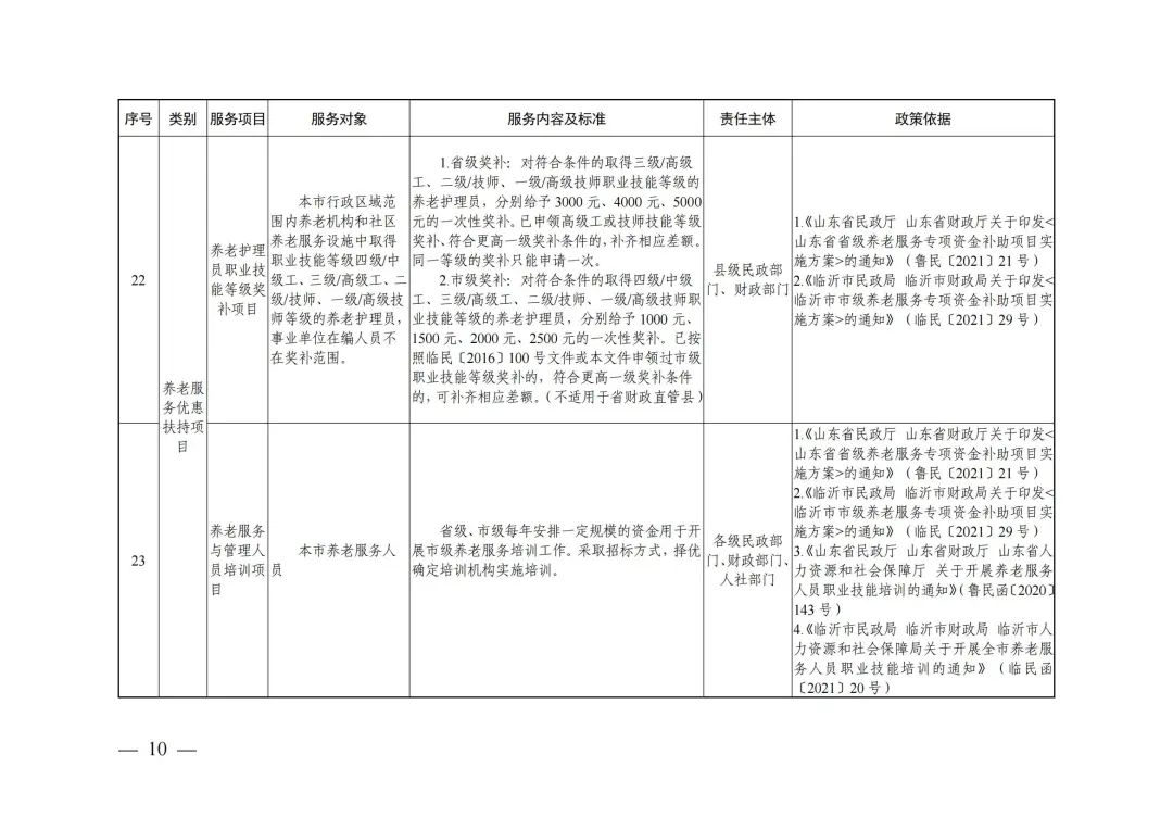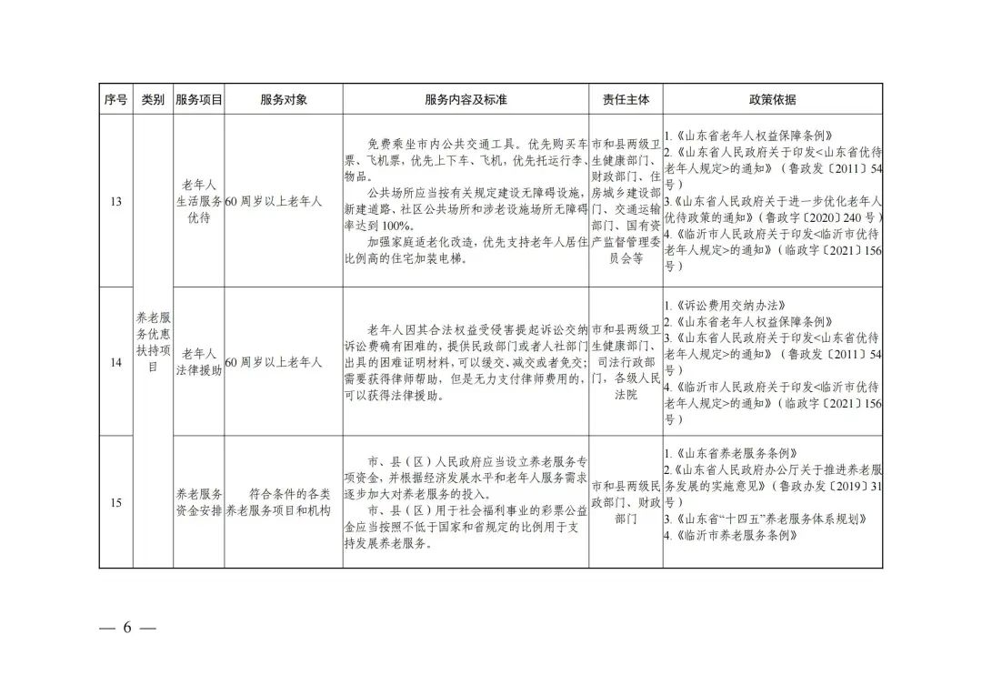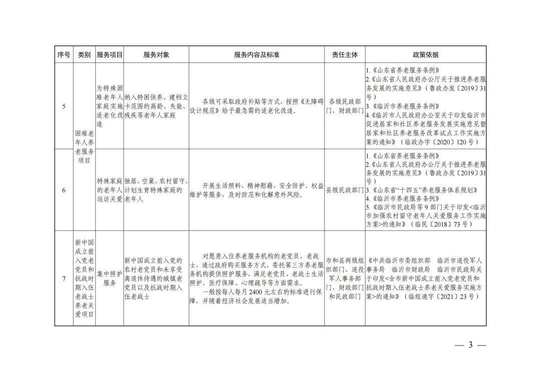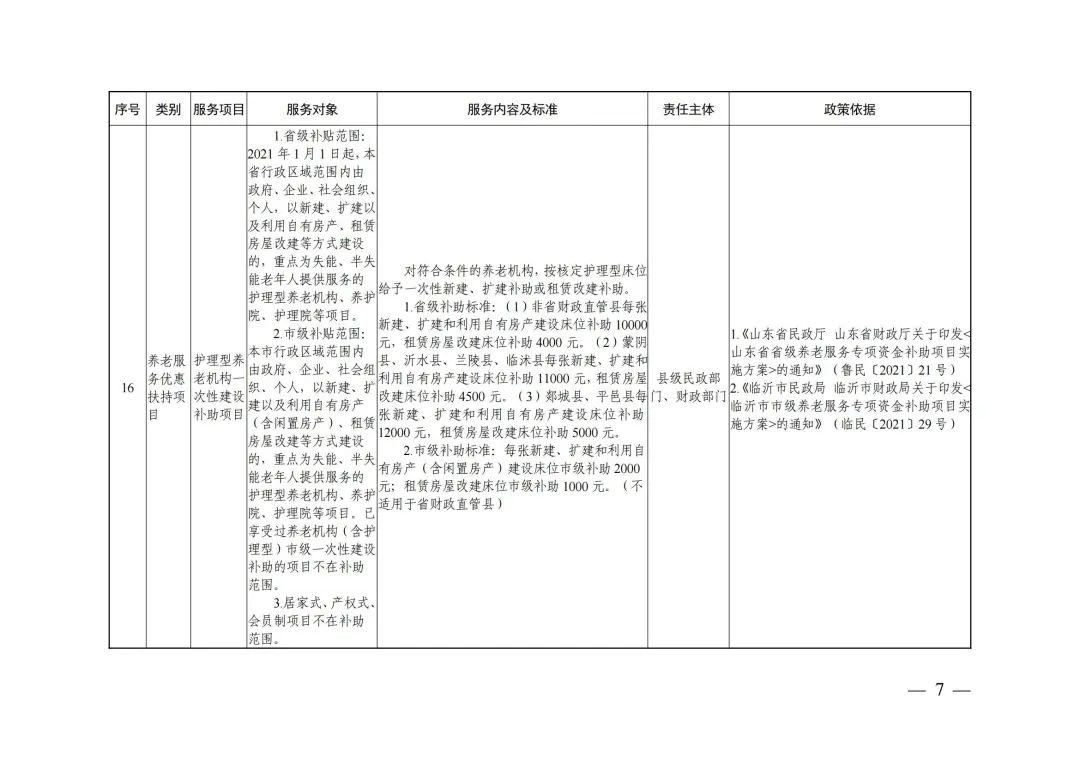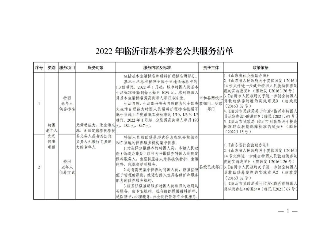 为贯彻落实《临沂市养老服务条例》,进一步完善我市基本养老服务体系,建立健全基本养老公共服务清单制度。近期,市养老事业发展服务中心依据省、市最新养老服务法律法规及相关政策文件,对清单内容进行了系统性整理及更新。5月14日,市社会养老服务体系建设领导小组办公室出台了《2022年临沂市基本养老公共服务清单》,通过列清单的方式明确了基本养老公共服务的类别、服务项目、服务内容及标准、责任主体和政策依据等。 本次出台的《清单》具体内容主要分为特困老年人兜底保障项目、困难老年人养老服务项目、新中国成立前入党老党员和抗战时期入伍老战士养老关爱项目、普惠型老年人服务和优待项目、养老服务优惠扶持项目、社区养老服务设施配建项目、临沂市全国居家和社区养老服务改革试点项目等七大类,共计32条清单。下一步,各县区将加强对《清单》落实情况的指导监督,优化服务流程,提高服务效率,确保《清单》项目落实到位,不断提高我市基本养老公共服务水平。