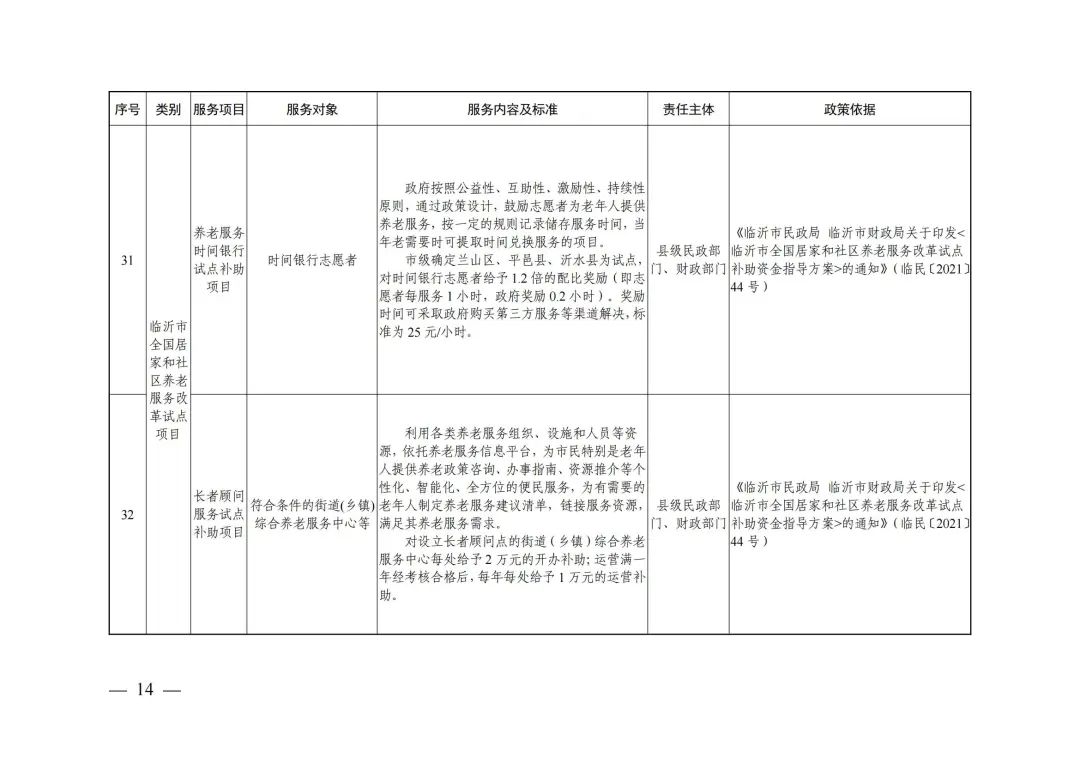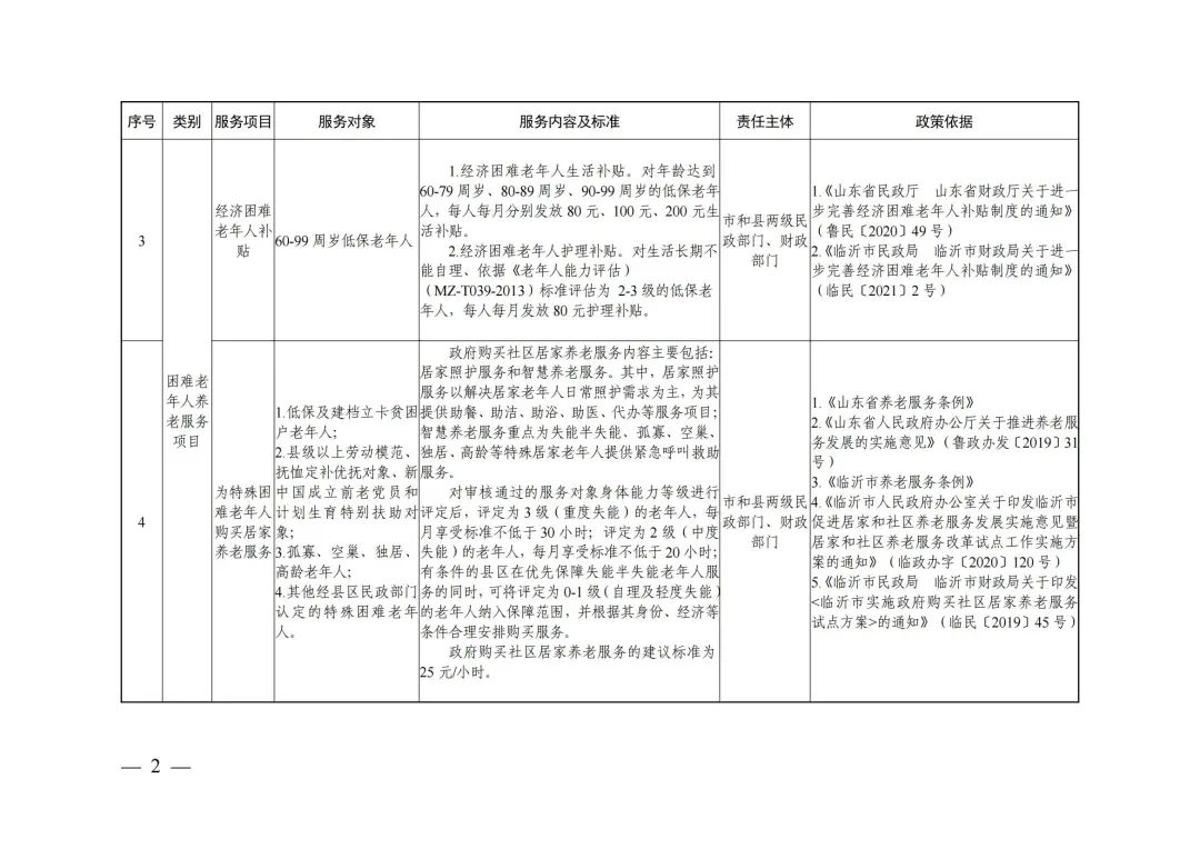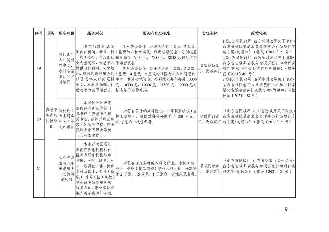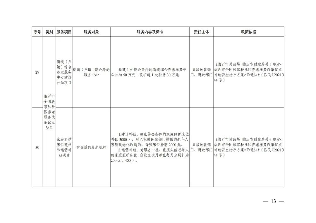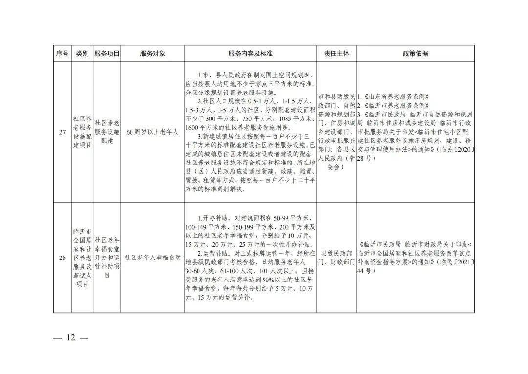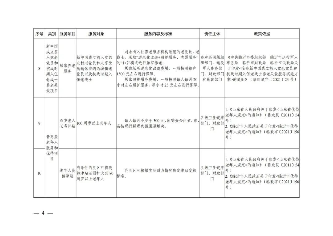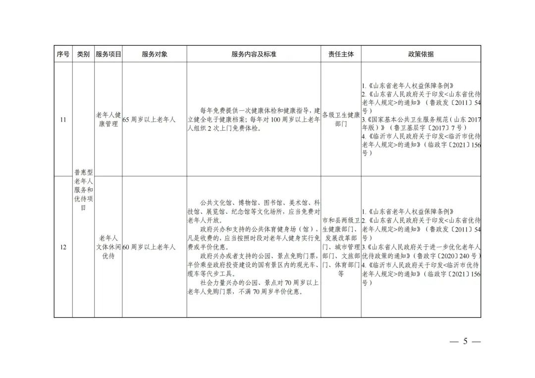 为贯彻落实《临沂市养老服务条例》,进一步完善我市基本养老服务体系,建立健全基本养老公共服务清单制度。近期,市养老事业发展服务中心依据省、市最新养老服务法律法规及相关政策文件,对清单内容进行了系统性整理及更新。5月14日,市社会养老服务体系建设领导小组办公室出台了《2022年临沂市基本养老公共服务清单》,通过列清单的方式明确了基本养老公共服务的类别、服务项目、服务内容及标准、责任主体和政策依据等。 本次出台的《清单》具体内容主要分为特困老年人兜底保障项目、困难老年人养老服务项目、新中国成立前入党老党员和抗战时期入伍老战士养老关爱项目、普惠型老年人服务和优待项目、养老服务优惠扶持项目、社区养老服务设施配建项目、临沂市全国居家和社区养老服务改革试点项目等七大类,共计32条清单。下一步,各县区将加强对《清单》落实情况的指导监督,优化服务流程,提高服务效率,确保《清单》项目落实到位,不断提高我市基本养老公共服务水平。