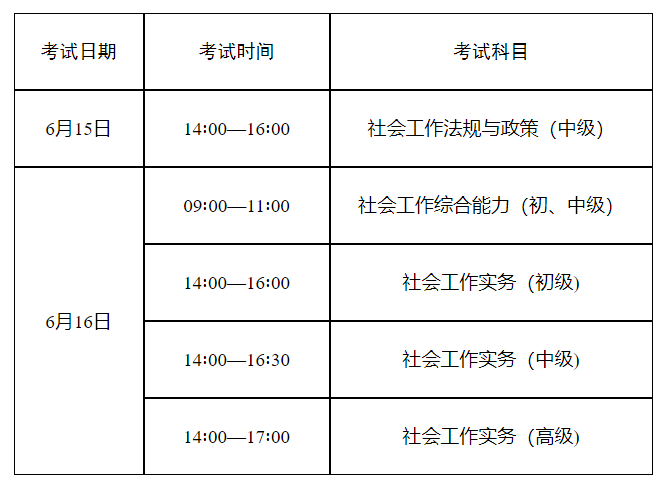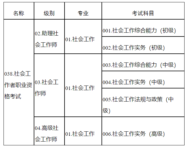 社会工作者职业资格考试分为三个考试管理,考试名称、级别、专业及考试科目信息设置为: