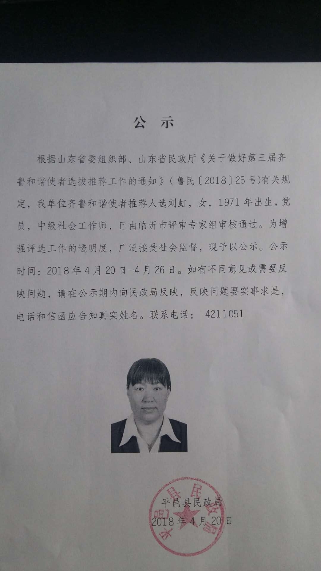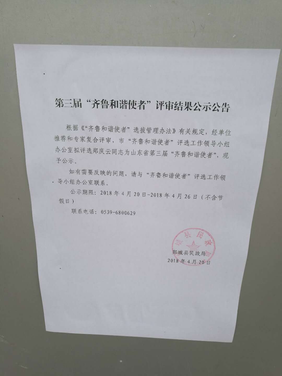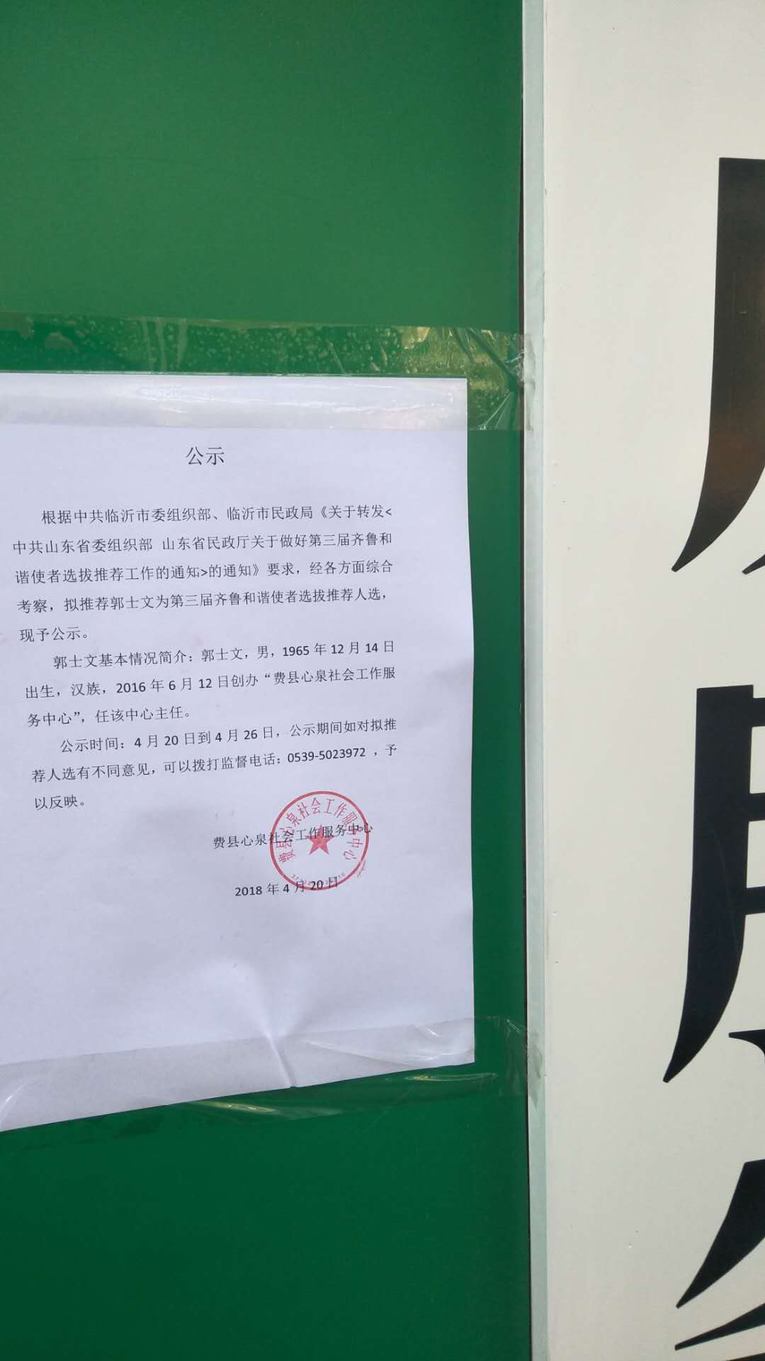 我市选拔第三届齐鲁和谐使者工作4月6日开始,选拔出报省参加第三届齐鲁和谐使者、齐鲁和谐使者(敬老使者)候选人11名,现将我市选拔推荐工作情况予以公示: