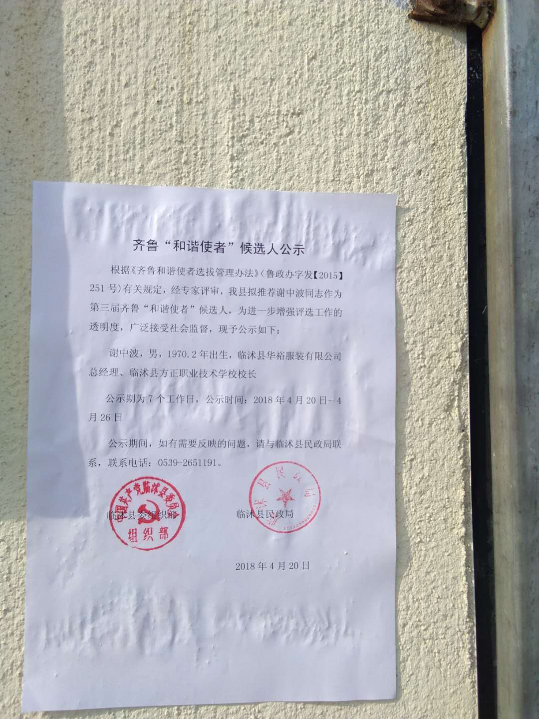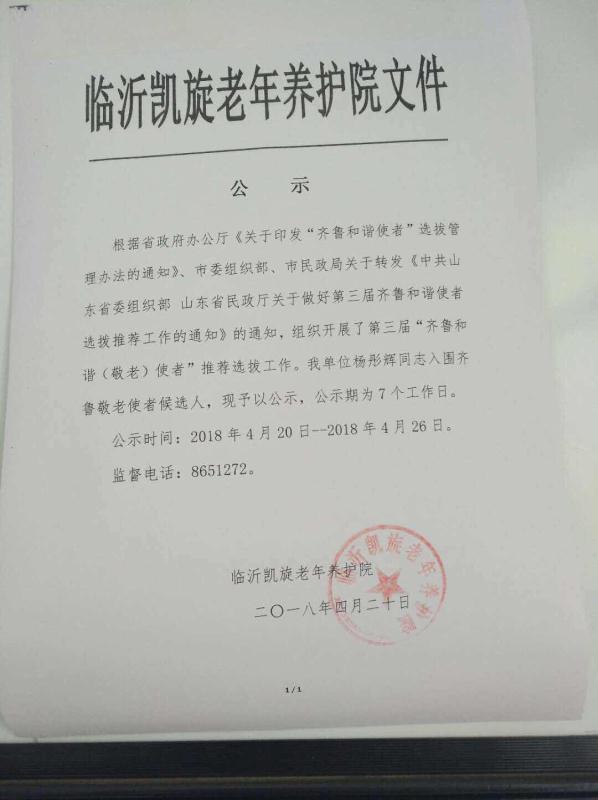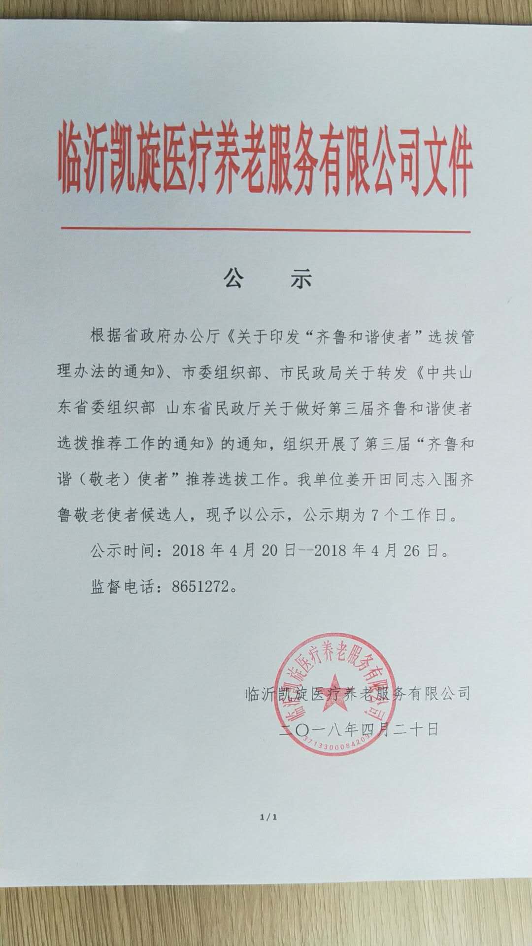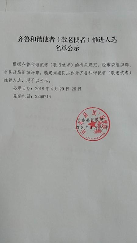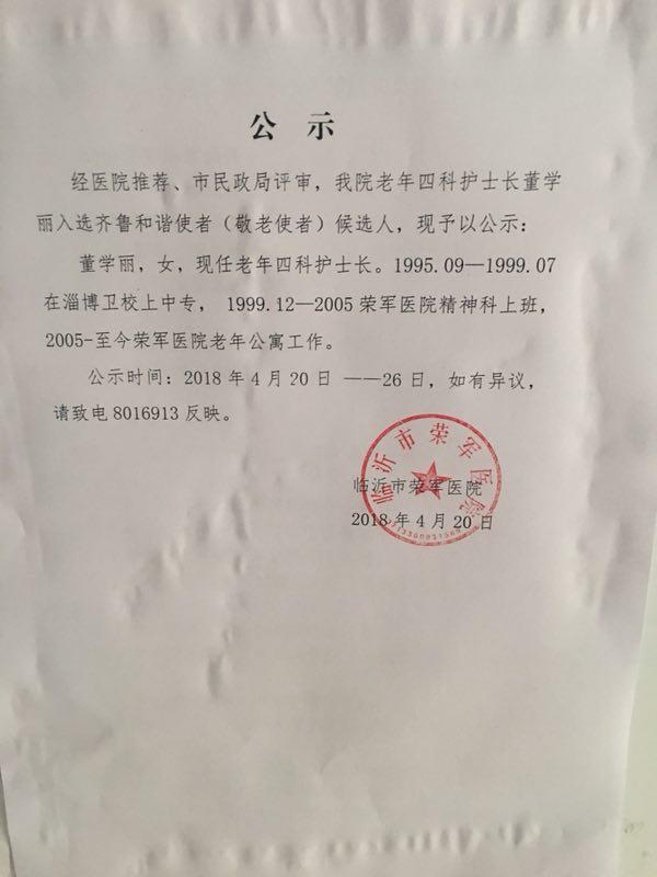 我市选拔第三届齐鲁和谐使者工作4月6日开始,选拔出报省参加第三届齐鲁和谐使者、齐鲁和谐使者(敬老使者)候选人11名,现将我市选拔推荐工作情况予以公示: