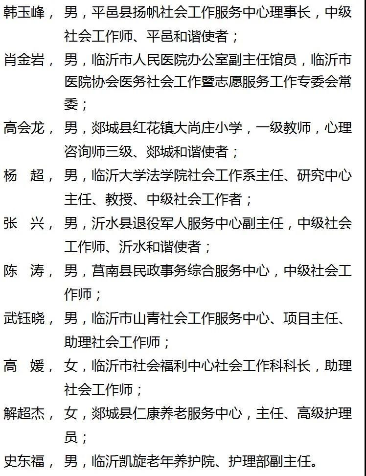 9月28日,第六届沂蒙和谐使者专家评审会圆满结束,拟推选韩玉峰等10名社会工作代表为第六届沂蒙和谐使者当选人。