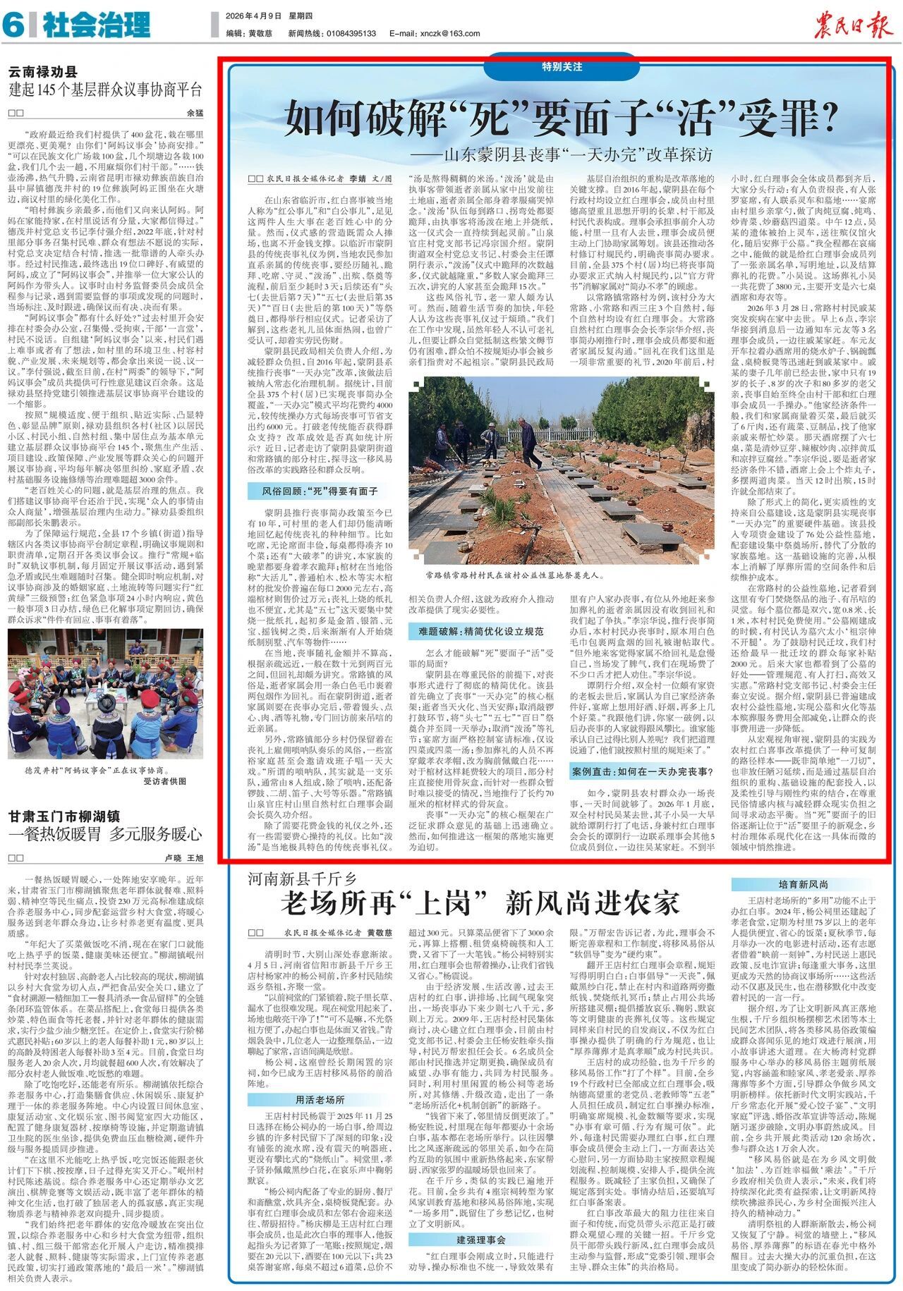 4月9日,《农民日报》刊发题为《如何破解“死”要面子“活”受罪?——山东蒙阴县丧事“一天办完”改革探访》文章,重点介绍了我市蒙阴县通过设立红白理事会,制定丧事形式框架,加强柔性引导和刚性约束,推行丧事“一天办完”改革的实践及成效。这种从“小切口”介入的路径,为促进殡葬移风易俗和乡风文明提供了有益借鉴和参考。